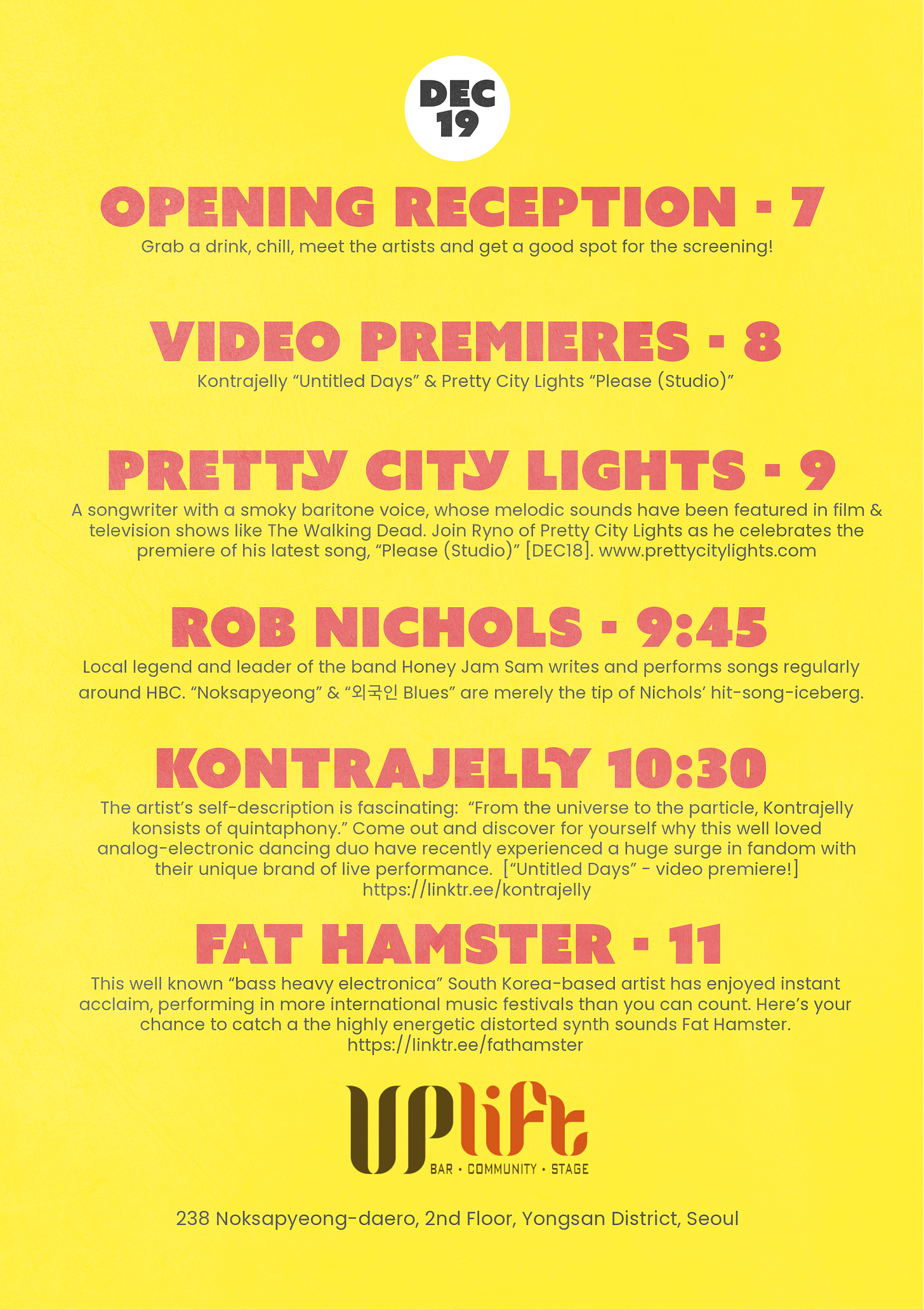 Dec 19th, 2025 - Seoul - Venue: Uplift Seoul - Free Entry - Video Premieres and Live performances from Fat Hamster, Kontrajelly, Rob Nichols, Pretty City Lights